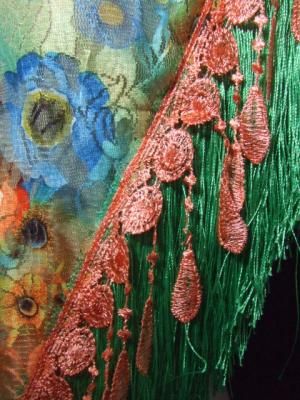 NEW バラレース花プリント地オレンジレース&グリーンフリンジシージョ